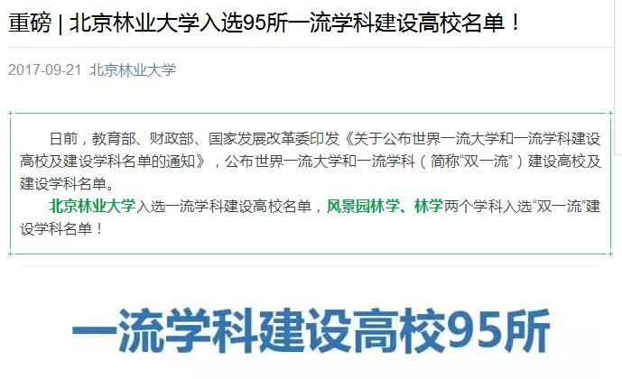 我校入选95所一流学科建设高校名单。风景园林学和林学两个学科入围“双一流”建设学科名单