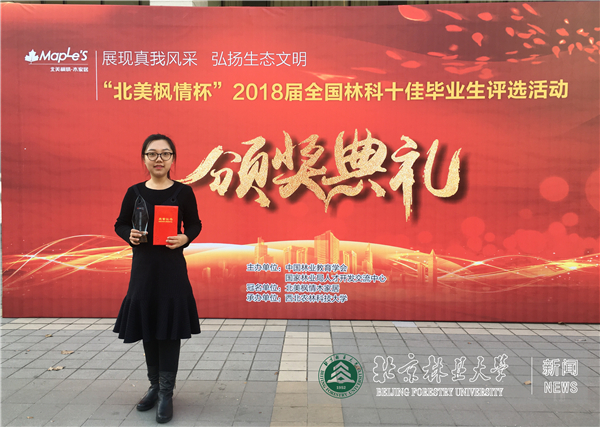 12月23日,由中国林业教育学会、国家林业局人才开发交流中心共同主办的北美枫情杯2018届全国林科十佳毕业生评选活动颁奖典礼在西北农林科技大学举行。水保学院水土保持与荒漠化防治专业硕士毕业生王葆喜获“全国林科十佳毕业生”荣誉称号。