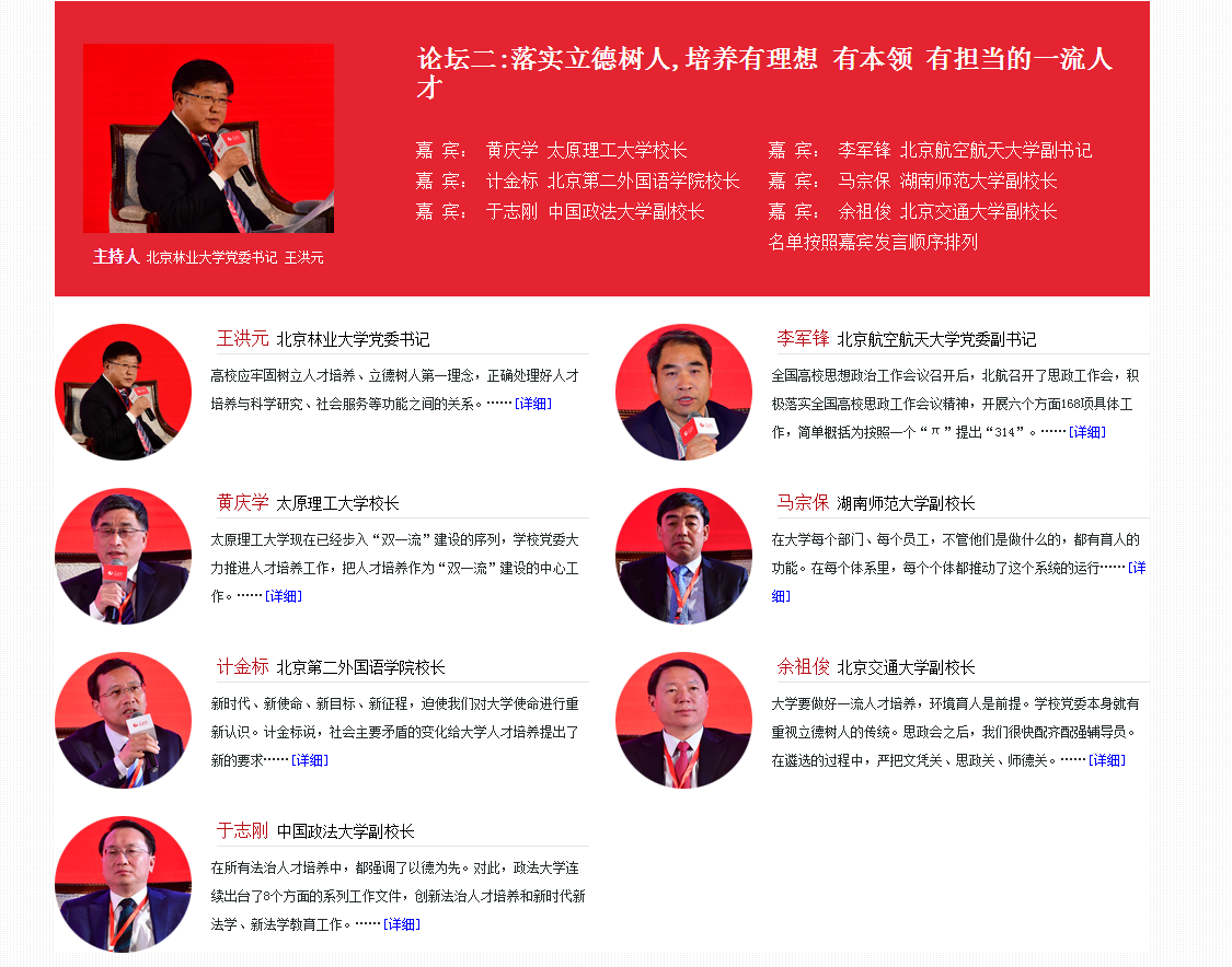 本届论坛设有加快“双一流”步伐,建设中国特色世界一流大学;落实立德树人,培养有理想、有本领、有担当的一流人才;加快转变高校发展方式,实现高等教育内涵式发展;高校如何服务地方经济社会发展四个主题论坛,40多位高校书记、校长出席论坛。